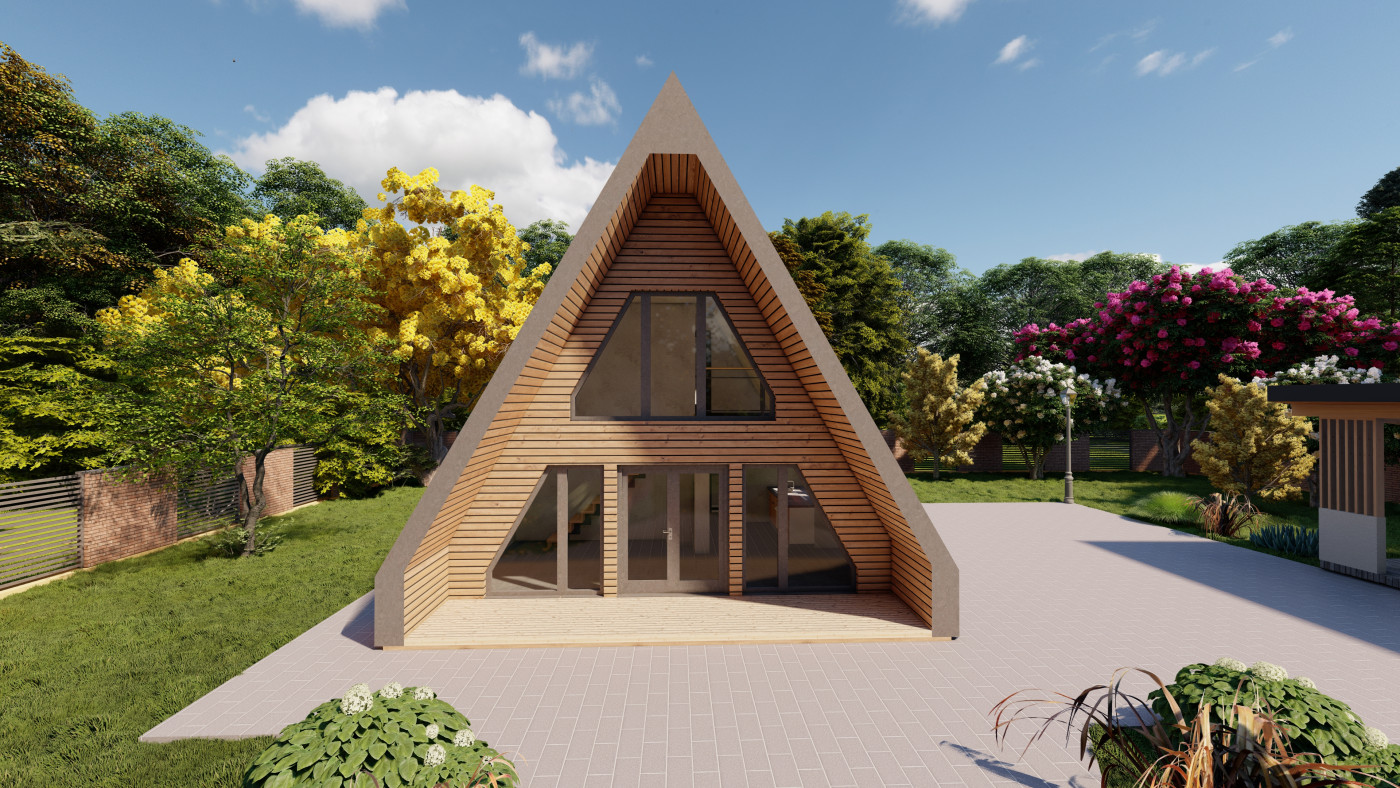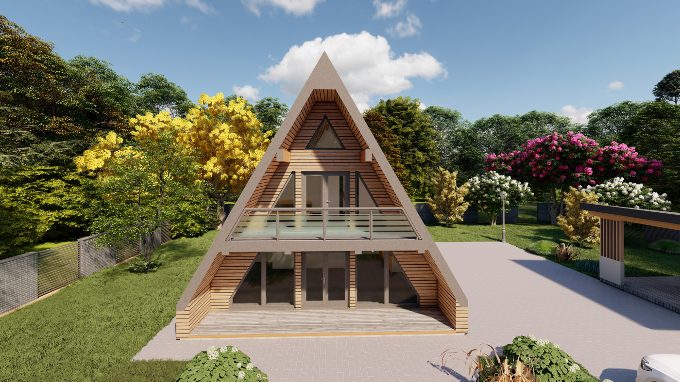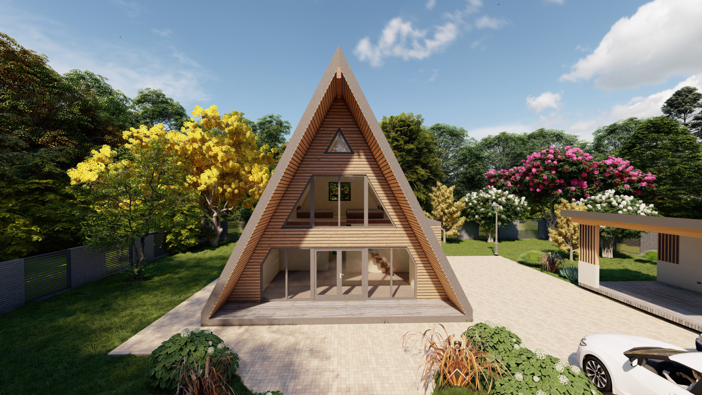 Minimalistický A-frame koncept navrhnutý pre prírodu, svetlo a čistý priestor.